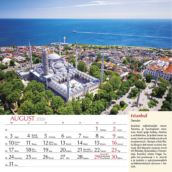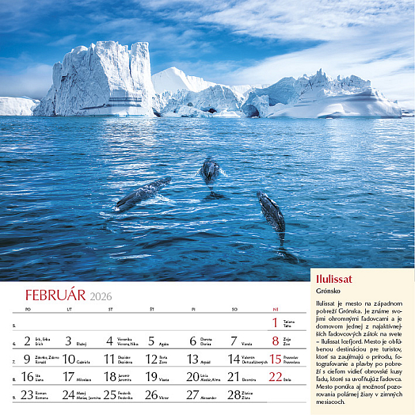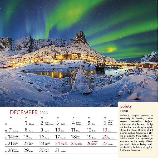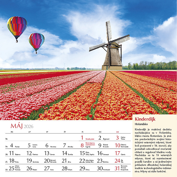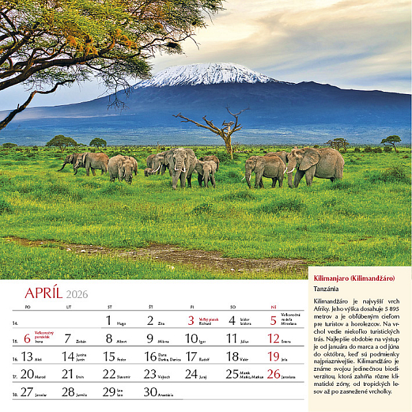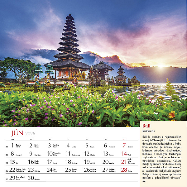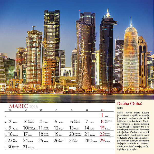 Precestujte celý svet prostredníctvom 12 výnimočných záberov z rôznych kútov planéty. Zachytáva rozmanitosť kultúr, prírody aj architektúry, od moderného lesku mesta Katar, cez ľadové scenérie Grónska, farebné tulipánové polia v Holandsku, chrámy Indonézie, dramatické islandské vodopády až po horské ticho Nepálu pod Himalájami. Každý mesiac je doplnený krátkym opisom daného miesta, aby ste sa mohli nielen pokochať pohľadom, ale aj spoznať niečo nové o svete okolo nás. Ideálny pre cestovateľov, milovníkov prírody a všetkých, ktorí radi objavujú krásu planéty Zem.
