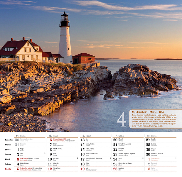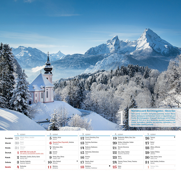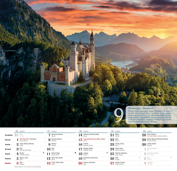Spoznajte s nami najkrajšie romantické miesta a prečítajte si krátku zaujímavosť o zobrazenom kúsku sveta. Mesačný nástenný kalendár obsahuje slovenské a české mená, štátne sviatky oboch krajín a fázy Mesiaca.