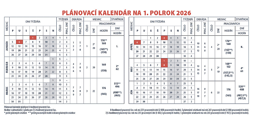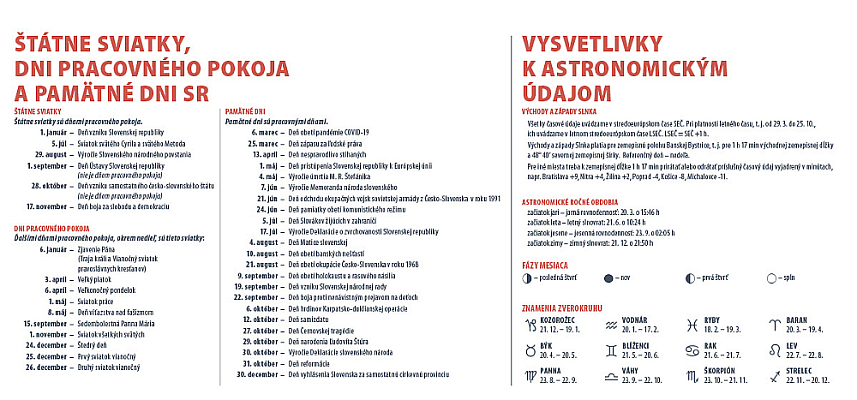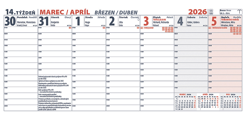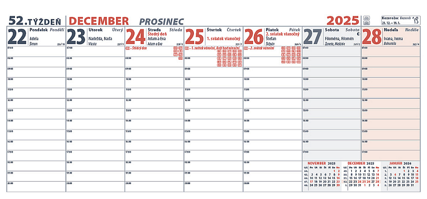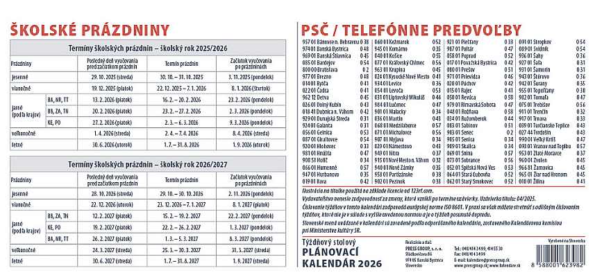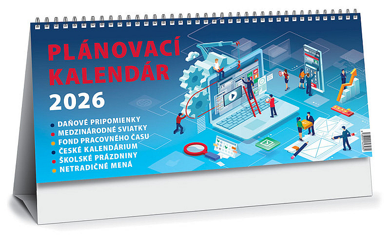 Plnofarebná obálka a zväčšený formát sú benefity stolového plánovacieho kalendára, ktorý obsahovo plne zodpovedá veľkému pracovnému kalendáru. Obsahuje dostatočný priestor na poznámky, týždňové stĺpcové kalendárium s hodinovým delením až do 20-tej hodiny, daňové pripomienky, fond pracovného času, mesačné kalendária, fázy Mesiaca, východy a západy Slnka, štátne sviatky všetkých krajín EÚ, školské prázdniny, znamenia zverokruhu, slovenské a české mená (plus netradičné mená).